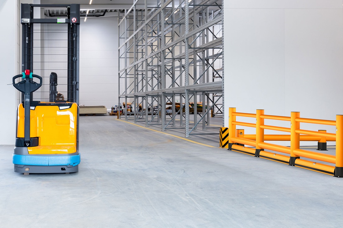 Die Rack-Mammut® Handlauf Einzelplanke eignet sich ideal für stark frequentierte Bereiche mit hohem Staplerverkehr. Sie sorgt für eine klare Abgrenzung von Fuß- und Fahrwegen und erhöht zuverlässig die Sicherheit. Die optionale Rack-Mammut® Bodenbarriere bietet zusätzlichen Schutz im unteren Bereich und verhindert wirkungsvoll Unterfahrkollisionen.